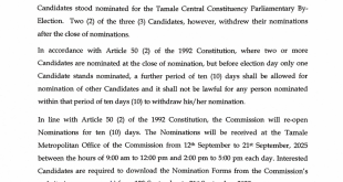 The Electoral Commission (EC) has reopened nominations for the Tamale Central by-election following the withdrawal of two out of three candidates who initially filed to contest. In a statement dated Friday, September 12, 2025, the Commission explained that under Article 50(2) of the 1992 Constitution, where more than one candidate …